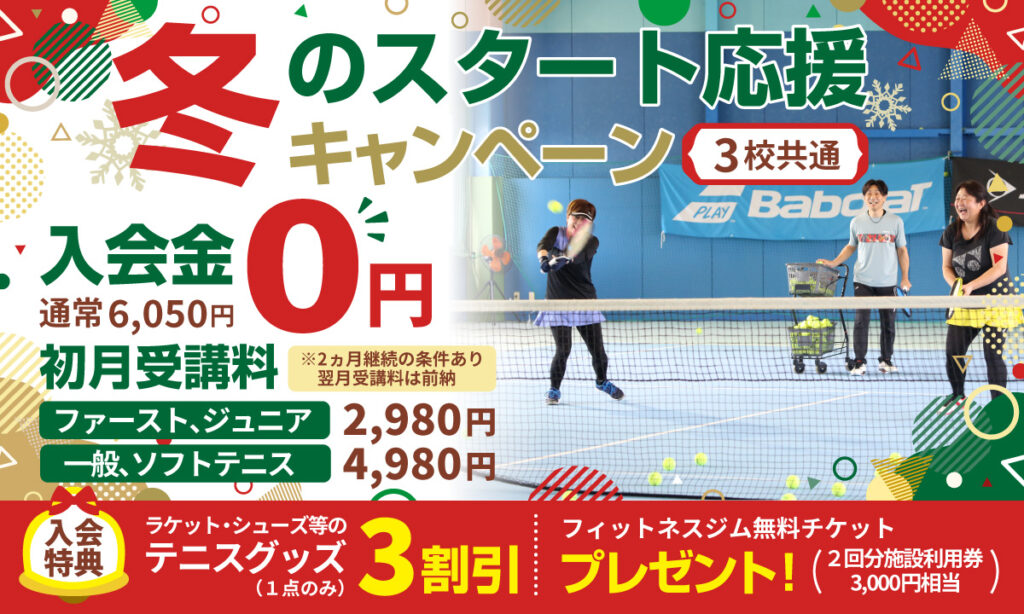 ございます。全くテニス経験のない初心者から学べる「ファースト」クラスは、ラケットの持ち方から基本的なショット(サーブ・ストローク・ボレー・スマッシュ)の打ち方まで楽しく丁寧にレッスンしていきます。