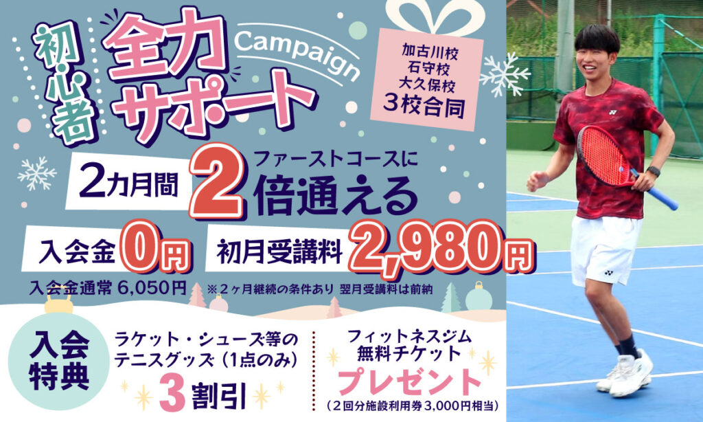 | キャンペーン内容 | ・入会金(通常 6,050円)が0円! ・初月受講料 ファースト、ジュニア 2,980円 一般、ソフトテニス 4,980円 |