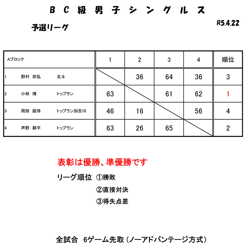 4/22 BC級男子シングルス大会結果 2023 4/24 お知らせ 大会結果 2023年4月24日 目次BC級男子シングルス大会(2023年4月22日開催) 2023年4月22日(土)、トップランテニスカレッジ石守校にて、加古川オープンサーキット「BC級男子シングルス大会」が開催されました。結果は以下の通りです。皆様、お疲れ様でした。 お知らせ 大会結果 4/14 CD級女子ダブルス大会結果 4/23 CD級男子シングルス大会結果 関連記事 2025年10月12日(日)開催「トップラントレセン」緊急募集!! 2025年10月6日 9/28 CD級男子シングルス大会結果 2025年9月29日 9/20 BC級男子シングルス大会結果 2025年9月24日 9/15 CD級男子シングルス大会結果 2025年9月24日 8/23 BC級男子シングルス大会結果 2025年8月27日 7/21 CD級男子シングルス大会結果 2025年7月28日 7/19 BC級男子シングルス大会結果 2025年7月23日 7/13 初心級男子シングルス大会結果 2025年7月14日