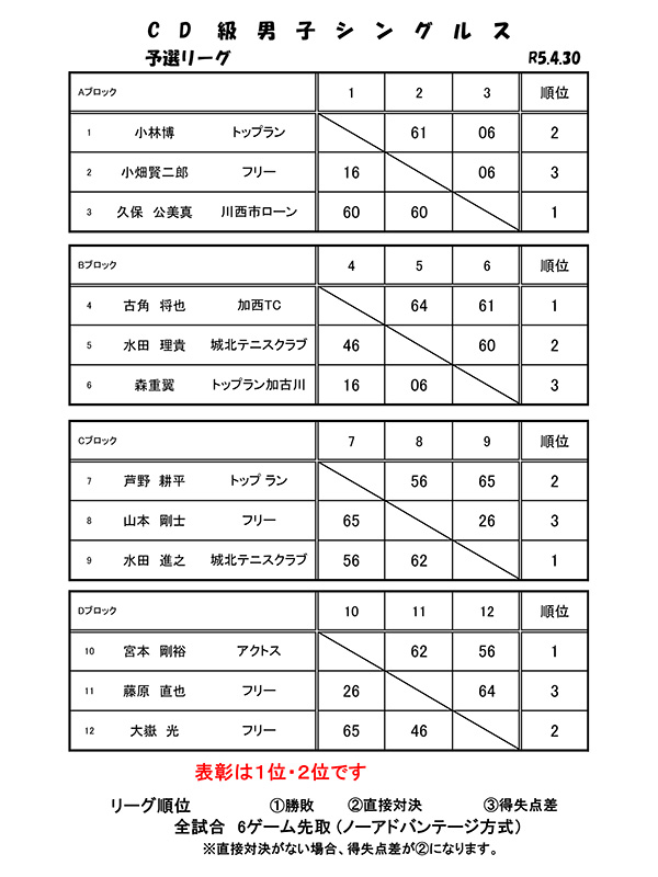 4/30 CD級男子シングルス大会結果 2023 5/10 お知らせ 大会結果 2023年5月10日 目次CD級男子シングルス大会(2023年4月30日開催) 2023年4月30日(日)、トップランテニスカレッジ石守校にて、加古川オープンサーキット「CD級男子シングルス大会」が開催されました。結果は以下の通りです。皆様、お疲れ様でした。 お知らせ 大会結果 4/29 初心級男子シングルス大会結果 5/3 BC級男子シングルス大会結果 関連記事 2025年10月12日(日)開催「トップラントレセン」緊急募集!! 2025年10月6日 9/28 CD級男子シングルス大会結果 2025年9月29日 9/20 BC級男子シングルス大会結果 2025年9月24日 9/15 CD級男子シングルス大会結果 2025年9月24日 8/23 BC級男子シングルス大会結果 2025年8月27日 7/21 CD級男子シングルス大会結果 2025年7月28日 7/19 BC級男子シングルス大会結果 2025年7月23日 7/13 初心級男子シングルス大会結果 2025年7月14日