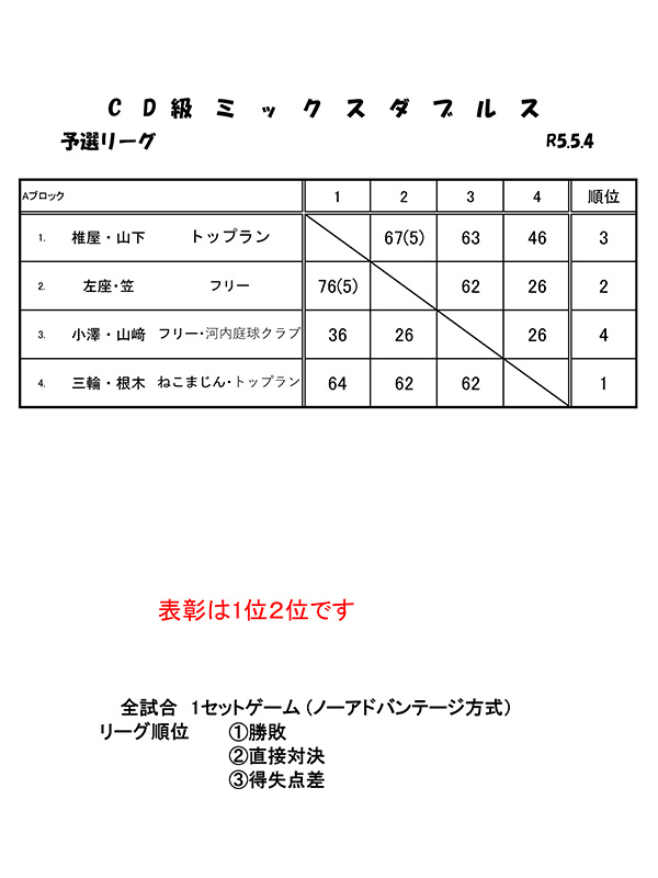 5/4 CD級ミックスダブルス大会結果 2023 5/10 お知らせ 大会結果 2023年5月10日 目次CD級ミックスダブルス大会(2023年5月4日開催) 2023年5月4日(木祝)、トップランテニスカレッジ石守校にて、加古川オープンサーキット「CD級ミックスダブルス大会」が開催されました。結果は以下の通りです。皆様、お疲れ様でした。 お知らせ 大会結果 5/3 BC級男子シングルス大会結果 5/5 DE級男子シングルス大会結果 関連記事 2025年10月12日(日)開催「トップラントレセン」緊急募集!! 2025年10月6日 9/28 CD級男子シングルス大会結果 2025年9月29日 9/20 BC級男子シングルス大会結果 2025年9月24日 9/15 CD級男子シングルス大会結果 2025年9月24日 8/23 BC級男子シングルス大会結果 2025年8月27日 7/21 CD級男子シングルス大会結果 2025年7月28日 7/19 BC級男子シングルス大会結果 2025年7月23日 7/13 初心級男子シングルス大会結果 2025年7月14日
