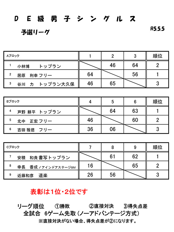 2023年5月5日(金祝)、トップランテニスカレッジ石守校にて、加古川オープンサーキット「DE級男子シングルス大会」が開催されました。結果は以下の通りです。皆様、お疲れ様でした。