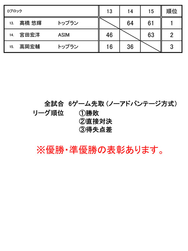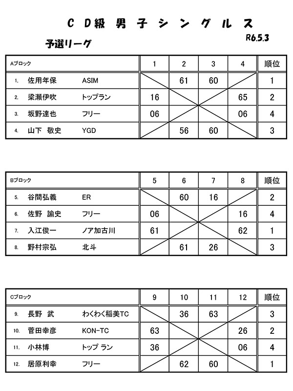 5/3 CD級男子シングルス大会結果 2024 5/09 お知らせ 大会結果 2024年5月9日 目次CD級男子シングルス大会(2024年5月3日開催) 2024年5月3日(金祝)、トップランテニスカレッジ石守校にて、加古川オープンサーキット「CD級男子シングルス大会」が開催されました。結果は以下の通りです。皆様、お疲れ様でした。 お知らせ 大会結果 4/29 BC級男子シングルス大会結果 5/5 CD級女子シングルス大会結果 関連記事 2025年10月12日(日)開催「トップラントレセン」緊急募集!! 2025年10月6日 9/28 CD級男子シングルス大会結果 2025年9月29日 9/20 BC級男子シングルス大会結果 2025年9月24日 9/15 CD級男子シングルス大会結果 2025年9月24日 8/23 BC級男子シングルス大会結果 2025年8月27日 7/21 CD級男子シングルス大会結果 2025年7月28日 7/19 BC級男子シングルス大会結果 2025年7月23日 7/13 初心級男子シングルス大会結果 2025年7月14日