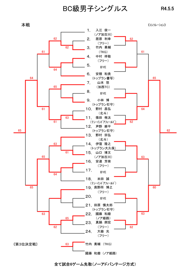 5/5 BC級男子シングルス大会結果 2022 6/13 お知らせ 大会結果 2022年5月9日2022年6月13日 目次BC級男子シングルス大会(2022年5月5日開催) 2022年5月5日(木・祝)、トップランテニスカレッジ石守校にて「BC級男子シングルス大会」が開催されました。結果は以下の通りです。皆様、お疲れ様でした。 お知らせ 大会結果 4/21 CD級女子ダブルス大会結果 5/15 CD級ミックスダブルス大会結果 関連記事 2025年10月12日(日)開催「トップラントレセン」緊急募集!! 2025年10月6日 9/28 CD級男子シングルス大会結果 2025年9月29日 9/20 BC級男子シングルス大会結果 2025年9月24日 9/15 CD級男子シングルス大会結果 2025年9月24日 8/23 BC級男子シングルス大会結果 2025年8月27日 7/21 CD級男子シングルス大会結果 2025年7月28日 7/19 BC級男子シングルス大会結果 2025年7月23日 7/13 初心級男子シングルス大会結果 2025年7月14日