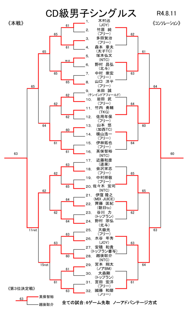8/11 CD級男子シングルス大会結果 2022 8/22 お知らせ 大会結果 2022年8月22日 目次CD級男子シングルス大会(2022年8月11日開催) 2022年8月11日(木・祝)、トップランテニスカレッジ石守校にて、加古川オープンサーキット「CD級男子シングルス大会」が開催されました。結果は以下の通りです。皆様、お疲れ様でした。 お知らせ 大会結果 7/18 BC級男子シングルス大会結果 8/21 BC級男子シングルス大会結果 関連記事 2025年10月12日(日)開催「トップラントレセン」緊急募集!! 2025年10月6日 9/28 CD級男子シングルス大会結果 2025年9月29日 9/20 BC級男子シングルス大会結果 2025年9月24日 9/15 CD級男子シングルス大会結果 2025年9月24日 8/23 BC級男子シングルス大会結果 2025年8月27日 7/21 CD級男子シングルス大会結果 2025年7月28日 7/19 BC級男子シングルス大会結果 2025年7月23日 7/13 初心級男子シングルス大会結果 2025年7月14日