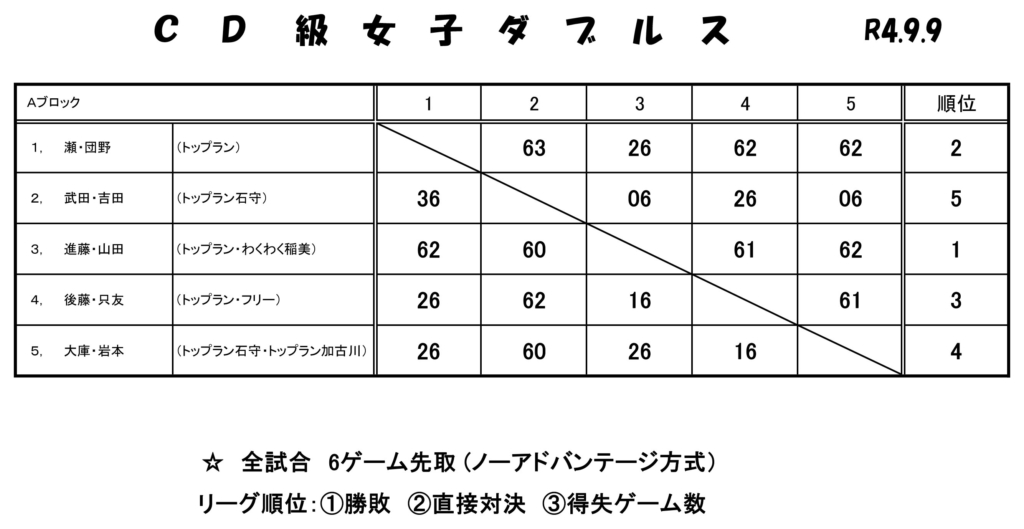 9/9 CD級女子ダブルス大会結果 2022 9/12 お知らせ 大会結果 2022年9月12日 目次CD級女子ダブルス大会(2022年9月9日開催) 2022年9月9日(金)、トップランテニスカレッジ石守校にて、加古川オープンサーキット「CD級女子ダブルス大会」が開催されました。結果は以下の通りです。皆様、お疲れ様でした。 お知らせ 大会結果 8/21 BC級男子シングルス大会結果 令和4年 近畿高校選抜テニス大会 トップランジュニアEXコース(相生学院)男女ともにシングルス・ダブルス優勝!! 関連記事 2025年10月12日(日)開催「トップラントレセン」緊急募集!! 2025年10月6日 9/28 CD級男子シングルス大会結果 2025年9月29日 9/20 BC級男子シングルス大会結果 2025年9月24日 9/15 CD級男子シングルス大会結果 2025年9月24日 8/23 BC級男子シングルス大会結果 2025年8月27日 7/21 CD級男子シングルス大会結果 2025年7月28日 7/19 BC級男子シングルス大会結果 2025年7月23日 7/13 初心級男子シングルス大会結果 2025年7月14日