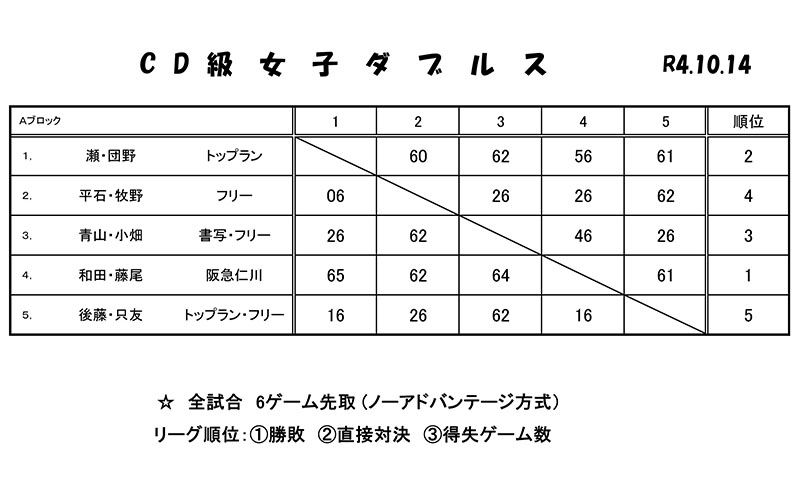10/14 CD級女子ダブルス大会結果 2022 10/24 お知らせ 大会結果 2022年10月24日 目次CD級女子ダブルス大会(2022年10月14日開催) 2022年10月14日(金)、トップランテニスカレッジ石守校にて、加古川オープンサーキット「CD級女子ダブルス大会」が開催されました。結果は以下の通りです。皆様、お疲れ様でした。 お知らせ 大会結果 10/14 BC級女子ダブルス大会結果 10/23 CD級ミックスダブルス大会結果 関連記事 2025年10月12日(日)開催「トップラントレセン」緊急募集!! 2025年10月6日 9/28 CD級男子シングルス大会結果 2025年9月29日 9/20 BC級男子シングルス大会結果 2025年9月24日 9/15 CD級男子シングルス大会結果 2025年9月24日 8/23 BC級男子シングルス大会結果 2025年8月27日 7/21 CD級男子シングルス大会結果 2025年7月28日 7/19 BC級男子シングルス大会結果 2025年7月23日 7/13 初心級男子シングルス大会結果 2025年7月14日