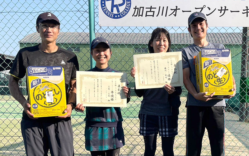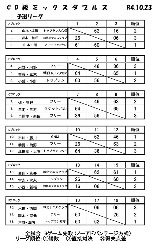 10/23 CD級ミックスダブルス大会結果 2022 10/24 お知らせ 大会結果 2022年10月24日 目次CD級ミックスダブルス大会(2022年10月23日開催) 2022年10月23日(日)、トップランテニスカレッジ石守校にて、加古川オープンサーキット「CD級ミックスダブルス大会」が開催されました。結果は以下の通りです。皆様、お疲れ様でした。 お知らせ 大会結果 10/14 CD級女子ダブルス大会結果 2022年11月「トップラントレセン」募集開始 関連記事 2025年10月12日(日)開催「トップラントレセン」緊急募集!! 2025年10月6日 9/28 CD級男子シングルス大会結果 2025年9月29日 9/20 BC級男子シングルス大会結果 2025年9月24日 9/15 CD級男子シングルス大会結果 2025年9月24日 8/23 BC級男子シングルス大会結果 2025年8月27日 7/21 CD級男子シングルス大会結果 2025年7月28日 7/19 BC級男子シングルス大会結果 2025年7月23日 7/13 初心級男子シングルス大会結果 2025年7月14日