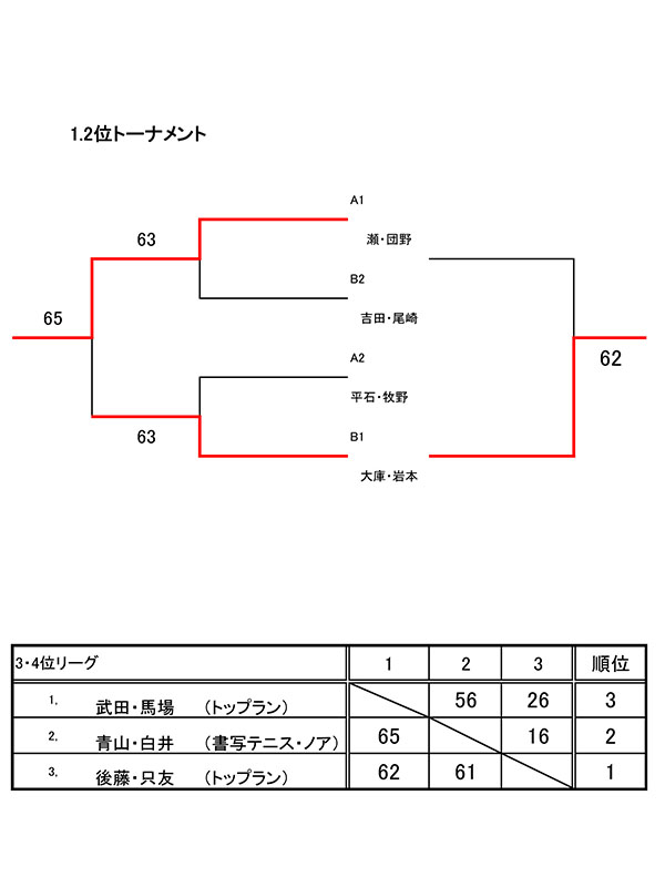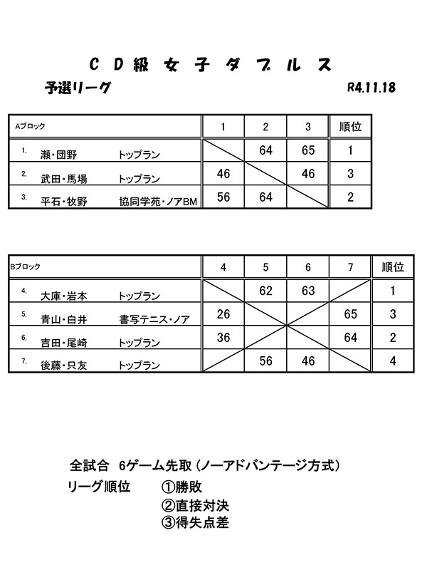 11/18 CD級女子ダブルス大会結果 2022 11/21 お知らせ 大会結果 2022年11月21日 目次CD級女子ダブルス大会(2022年11月18日開催) 2022年11月18日(金)、トップランテニスカレッジ石守校にて、加古川オープンサーキット「CD級女子ダブルス大会」が開催されました。結果は以下の通りです。皆様、お疲れ様でした。 お知らせ 大会結果 第45回全国選抜高校テニス大会 近畿地区予選 男子優勝(14連覇) 女子優勝(9連覇) 11/20 CD級ミックスダブルス大会結果 関連記事 2025年10月12日(日)開催「トップラントレセン」緊急募集!! 2025年10月6日 9/28 CD級男子シングルス大会結果 2025年9月29日 9/20 BC級男子シングルス大会結果 2025年9月24日 9/15 CD級男子シングルス大会結果 2025年9月24日 8/23 BC級男子シングルス大会結果 2025年8月27日 7/21 CD級男子シングルス大会結果 2025年7月28日 7/19 BC級男子シングルス大会結果 2025年7月23日 7/13 初心級男子シングルス大会結果 2025年7月14日