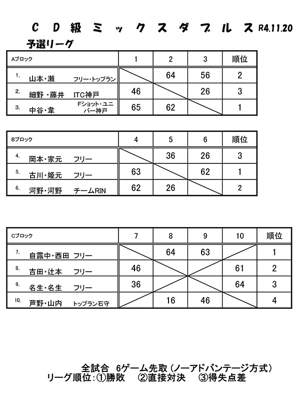 11/20 CD級ミックスダブルス大会結果 2022 11/21 お知らせ 大会結果 2022年11月21日 目次CD級ミックスダブルス大会(2022年11月20日開催) 2022年11月20日(日)、トップランテニスカレッジ石守校にて、加古川オープンサーキット「CD級ミックスダブルス大会」が開催されました。結果は以下の通りです。皆様、お疲れ様でした。 お知らせ 大会結果 11/18 CD級女子ダブルス大会結果 12/9 CD級女子ダブルス大会結果 関連記事 2025年10月12日(日)開催「トップラントレセン」緊急募集!! 2025年10月6日 9/28 CD級男子シングルス大会結果 2025年9月29日 9/20 BC級男子シングルス大会結果 2025年9月24日 9/15 CD級男子シングルス大会結果 2025年9月24日 8/23 BC級男子シングルス大会結果 2025年8月27日 7/21 CD級男子シングルス大会結果 2025年7月28日 7/19 BC級男子シングルス大会結果 2025年7月23日 7/13 初心級男子シングルス大会結果 2025年7月14日
