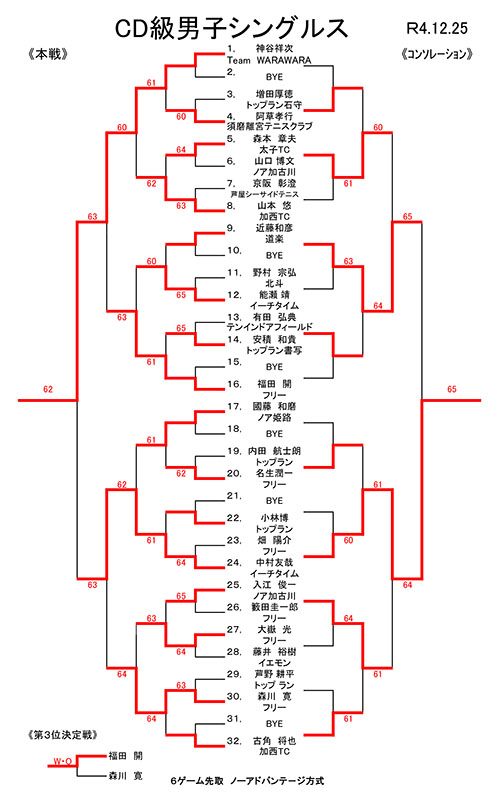 12/25 CD級男子シングルス大会結果 2023 1/16 お知らせ 大会結果 2023年1月16日 目次CD級男子シングルス大会(2022年12月25日開催) 2022年12月25日(日)、トップランテニスカレッジ石守校にて、加古川オープンサーキット「CD級男子シングルス大会」が開催されました。結果は以下の通りです。皆様、お疲れ様でした。 お知らせ 大会結果 12/4 BC級男子シングルス大会結果 1/9 オープン男子ダブルス団体戦大会結果 関連記事 2025年10月12日(日)開催「トップラントレセン」緊急募集!! 2025年10月6日 9/28 CD級男子シングルス大会結果 2025年9月29日 9/20 BC級男子シングルス大会結果 2025年9月24日 9/15 CD級男子シングルス大会結果 2025年9月24日 8/23 BC級男子シングルス大会結果 2025年8月27日 7/21 CD級男子シングルス大会結果 2025年7月28日 7/19 BC級男子シングルス大会結果 2025年7月23日 7/13 初心級男子シングルス大会結果 2025年7月14日