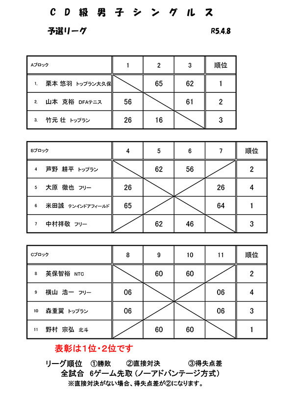 2023年4月8日(土)、トップランテニスカレッジ石守校にて、加古川オープンサーキット「CD級男子シングルス大会」が開催されました。結果は以下の通りです。皆様、お疲れ様でした。