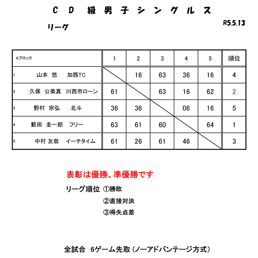 5/13 CD級男子シングルス大会結果