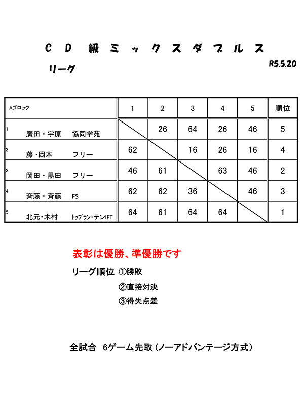 5/20 CD級ミックスダブルス大会結果 2023 5/22 お知らせ 大会結果 2023年5月22日 目次CD級ミックスダブルス大会(2023年5月20日開催) 2023年5月20日(土)、トップランテニスカレッジ石守校にて、加古川オープンサーキット「CD級ミックスダブルス大会」が開催されました。結果は以下の通りです。皆様、お疲れ様でした。 お知らせ 大会結果 5/13 CD級男子シングルス大会結果 5/21 初心級男子シングルス大会結果 関連記事 2025年10月12日(日)開催「トップラントレセン」緊急募集!! 2025年10月6日 9/28 CD級男子シングルス大会結果 2025年9月29日 9/20 BC級男子シングルス大会結果 2025年9月24日 9/15 CD級男子シングルス大会結果 2025年9月24日 8/23 BC級男子シングルス大会結果 2025年8月27日 7/21 CD級男子シングルス大会結果 2025年7月28日 7/19 BC級男子シングルス大会結果 2025年7月23日 7/13 初心級男子シングルス大会結果 2025年7月14日