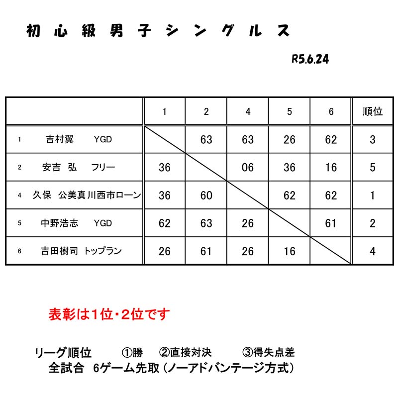 6/24 初心級男子シングルス大会結果 2023 6/29 お知らせ 大会結果 2023年6月29日 目次初心級男子シングルス大会(2023年6月24日開催) 2023年6月24日(土)、トップランテニスカレッジ石守校にて、加古川オープンサーキット「初心級男子シングルス大会」が開催されました。結果は以下の通りです。皆様、お疲れ様でした。 お知らせ 大会結果 6/23 CD級女子ダブルス大会結果 6/25 DE級男子シングルス大会結果 関連記事 2025年10月12日(日)開催「トップラントレセン」緊急募集!! 2025年10月6日 9/28 CD級男子シングルス大会結果 2025年9月29日 9/20 BC級男子シングルス大会結果 2025年9月24日 9/15 CD級男子シングルス大会結果 2025年9月24日 8/23 BC級男子シングルス大会結果 2025年8月27日 7/21 CD級男子シングルス大会結果 2025年7月28日 7/19 BC級男子シングルス大会結果 2025年7月23日 7/13 初心級男子シングルス大会結果 2025年7月14日