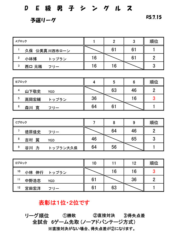 7/15 DE級男子シングルス大会結果 2023 7/24 大会結果 2023年7月24日 目次DE級男子シングルス大会(2023年7月15日開催) 2023年7月15日(土)、トップランテニスカレッジ石守校にて、加古川オープンサーキット「DE級男子シングルス大会」が開催されました。結果は以下の通りです。皆様、お疲れ様でした。 大会結果 7/14 CD級女子ダブルス大会結果 7/16 CD級女子ダブルス大会結果 関連記事 9/28 CD級男子シングルス大会結果 2025年9月29日 9/20 BC級男子シングルス大会結果 2025年9月24日 9/15 CD級男子シングルス大会結果 2025年9月24日 8/23 BC級男子シングルス大会結果 2025年8月27日 7/21 CD級男子シングルス大会結果 2025年7月28日 7/19 BC級男子シングルス大会結果 2025年7月23日 7/13 初心級男子シングルス大会結果 2025年7月14日 6/28 CD級男子シングルス大会結果 2025年6月30日