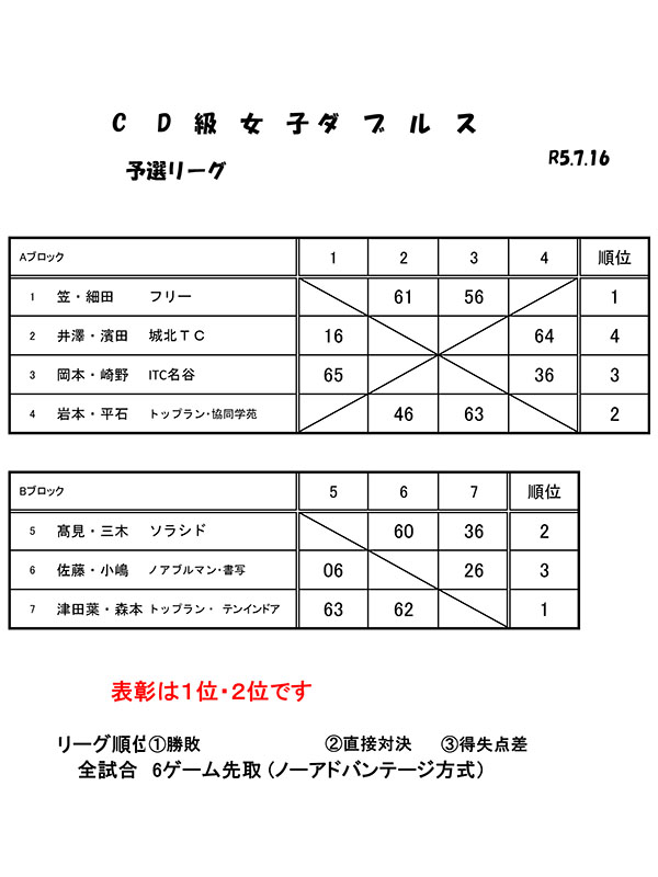 2023年7月16日(日)、トップランテニスカレッジ石守校にて、加古川オープンサーキット「CD級女子ダブルス大会」が開催されました。結果は以下の通りです。皆様、お疲れ様でした。