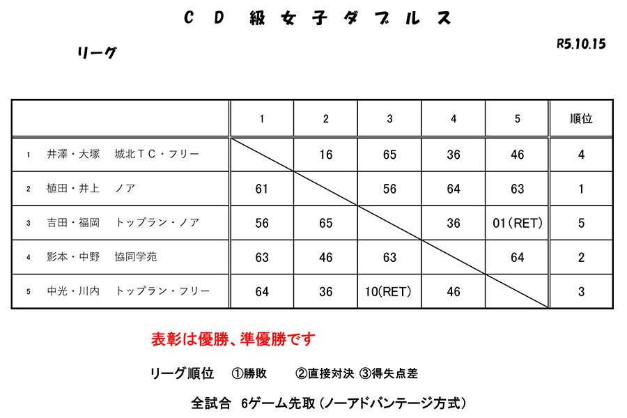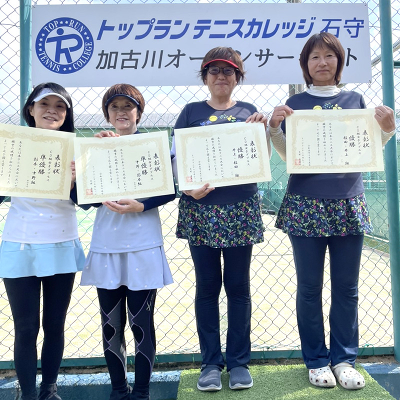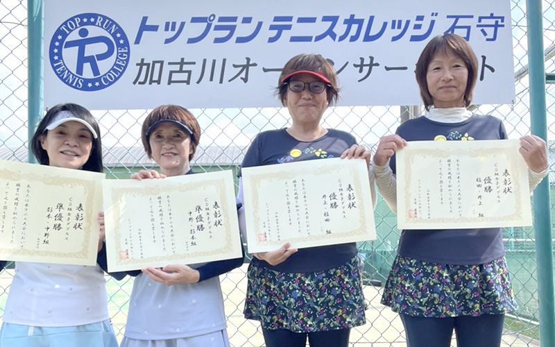 2023年10月15日(日)、トップランテニスカレッジ石守校にて、加古川オープンサーキット「CD級女子ダブルス大会」が開催されました。結果は以下の通りです。皆様、お疲れ様でした。