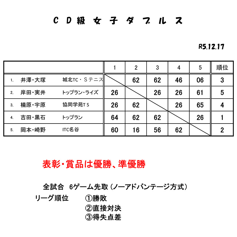 12/17 CD級女子ダブルス大会結果 2023 12/21 大会結果 2023年12月21日 目次CD級女子ダブルス大会(2023年12月17日開催) 2023年12月17日(日)、トップランテニスカレッジ石守校にて、加古川オープンサーキット「CD級女子ダブルス大会」が開催されました。結果は以下の通りです。皆様、お疲れ様でした。 大会結果 12/16 BC級男子シングルス大会結果 12/23 初心級級男子シングルス大会結果 関連記事 9/28 CD級男子シングルス大会結果 2025年9月29日 9/20 BC級男子シングルス大会結果 2025年9月24日 9/15 CD級男子シングルス大会結果 2025年9月24日 8/23 BC級男子シングルス大会結果 2025年8月27日 7/21 CD級男子シングルス大会結果 2025年7月28日 7/19 BC級男子シングルス大会結果 2025年7月23日 7/13 初心級男子シングルス大会結果 2025年7月14日 6/28 CD級男子シングルス大会結果 2025年6月30日