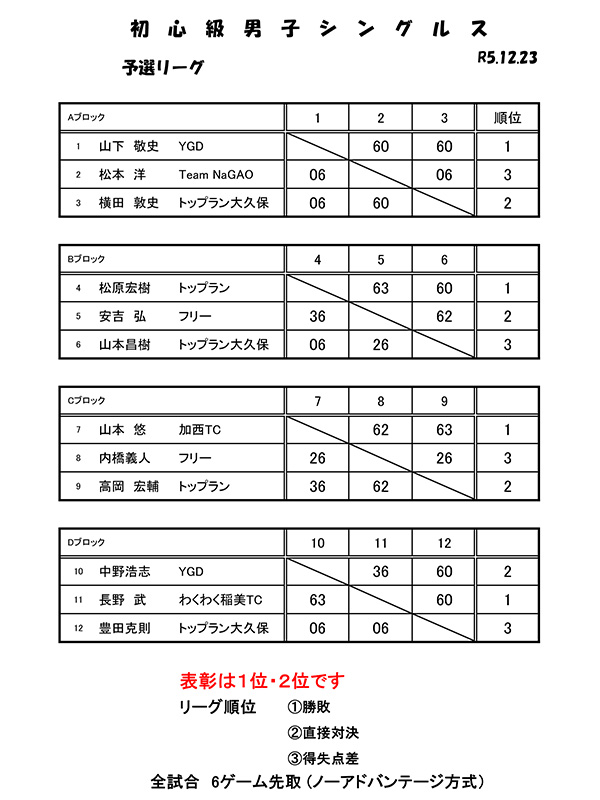 12/23 初心級級男子シングルス大会結果 2023 12/26 大会結果 2023年12月26日 目次初心級級男子シングルス大会(2023年12月23日開催) 2023年12月23日(土)、トップランテニスカレッジ石守校にて、加古川オープンサーキット「初心級級男子シングルス大会」が開催されました。結果は以下の通りです。皆様、お疲れ様でした。 大会結果 12/17 CD級女子ダブルス大会結果 12/24 CD級ミックスダブルス大会結果 関連記事 9/28 CD級男子シングルス大会結果 2025年9月29日 9/20 BC級男子シングルス大会結果 2025年9月24日 9/15 CD級男子シングルス大会結果 2025年9月24日 8/23 BC級男子シングルス大会結果 2025年8月27日 7/21 CD級男子シングルス大会結果 2025年7月28日 7/19 BC級男子シングルス大会結果 2025年7月23日 7/13 初心級男子シングルス大会結果 2025年7月14日 6/28 CD級男子シングルス大会結果 2025年6月30日