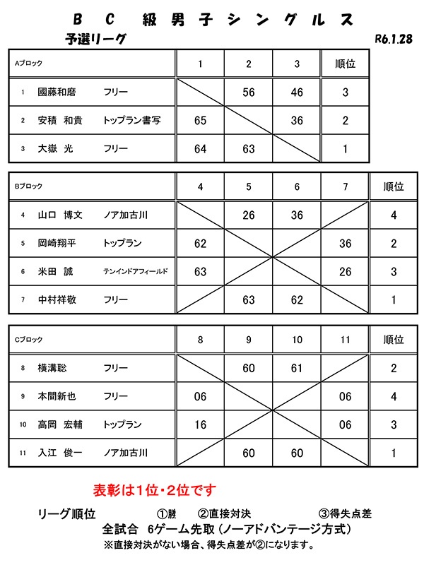 1/28 BC級男子シングルス大会結果 2024 2/01 大会結果 2024年2月1日 目次BC級男子シングルス大会(2024年1月28日開催) 2024年1月28日(日)、トップランテニスカレッジ石守校にて、加古川オープンサーキット「BC級男子シングルス大会」が開催されました。結果は以下の通りです。皆様、お疲れ様でした。 大会結果 1/21 CD級ミックスダブルス大会結果 2/18 CD級女子シングルス大会結果 関連記事 11/24 初心級男子シングルス大会結果 2025年11月26日 11/21 初心級女子ダブルス大会結果 2025年11月26日 11/8 BC級男子シングルス大会結果 2025年11月13日 11/3 CD級男子シングルス大会結果 2025年11月5日 10/11 初心級男子シングルス大会結果 2025年11月5日 9/28 CD級男子シングルス大会結果 2025年9月29日 9/20 BC級男子シングルス大会結果 2025年9月24日 9/15 CD級男子シングルス大会結果 2025年9月24日