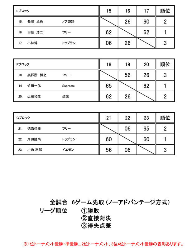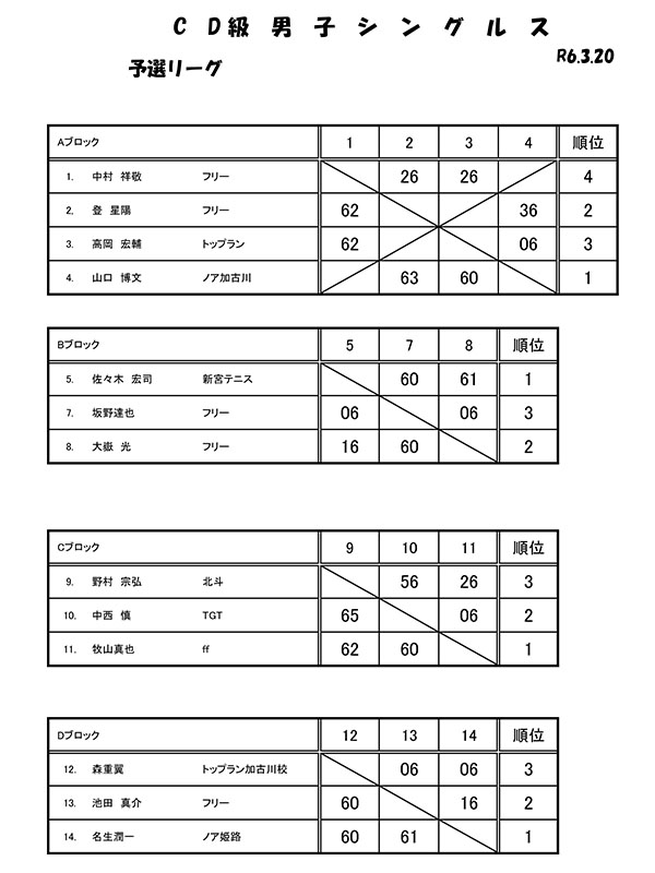 3/20 CD級男子シングルス大会結果 2024 4/02 大会結果 2024年4月2日 目次CD級男子シングルス大会(2024年3月20日開催) 2024年3月20日(水祝)、トップランテニスカレッジ石守校にて、加古川オープンサーキット「CD級男子シングルス大会」が開催されました。結果は以下の通りです。皆様、お疲れ様でした。 大会結果 2/24 CD級男子シングルス大会結果 3/22 CD級女子ダブルス大会結果 関連記事 9/28 CD級男子シングルス大会結果 2025年9月29日 9/20 BC級男子シングルス大会結果 2025年9月24日 9/15 CD級男子シングルス大会結果 2025年9月24日 8/23 BC級男子シングルス大会結果 2025年8月27日 7/21 CD級男子シングルス大会結果 2025年7月28日 7/19 BC級男子シングルス大会結果 2025年7月23日 7/13 初心級男子シングルス大会結果 2025年7月14日 6/28 CD級男子シングルス大会結果 2025年6月30日