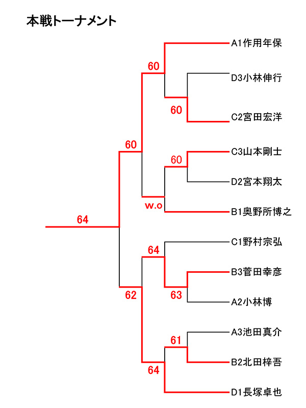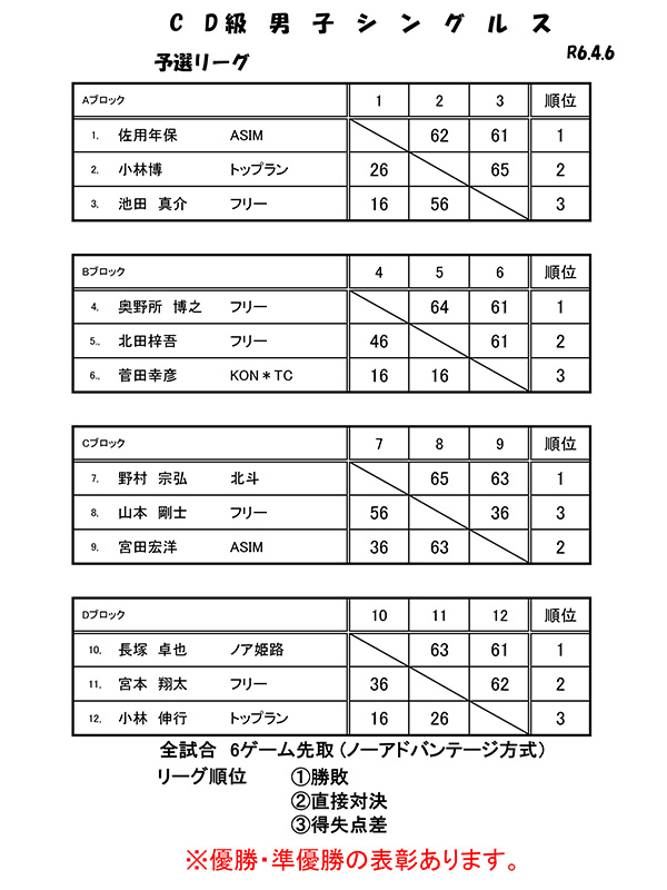 4/6 CD級男子シングルス大会結果 2024 4/08 大会結果 2024年4月8日 目次CD級男子シングルス大会(2024年4月6日開催) 2024年4月6日(土)、トップランテニスカレッジ石守校にて、加古川オープンサーキット「CD級男子シングルス大会」が開催されました。結果は以下の通りです。皆様、お疲れ様でした。 大会結果 3/22 CD級女子ダブルス大会結果 3/30 初心級男子シングルス大会結果 関連記事 9/28 CD級男子シングルス大会結果 2025年9月29日 9/20 BC級男子シングルス大会結果 2025年9月24日 9/15 CD級男子シングルス大会結果 2025年9月24日 8/23 BC級男子シングルス大会結果 2025年8月27日 7/21 CD級男子シングルス大会結果 2025年7月28日 7/19 BC級男子シングルス大会結果 2025年7月23日 7/13 初心級男子シングルス大会結果 2025年7月14日 6/28 CD級男子シングルス大会結果 2025年6月30日