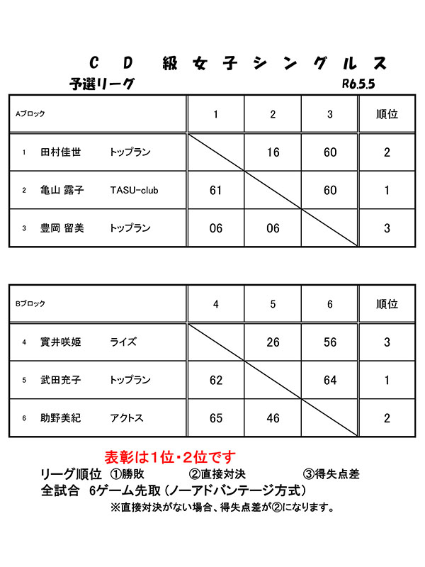 5/5 CD級女子シングルス大会結果 2024 5/09 お知らせ 大会結果 2024年5月9日 目次CD級女子シングルス大会(2024年5月5日開催) 2024年5月5日(日)、トップランテニスカレッジ石守校にて、加古川オープンサーキット「CD級女子シングルス大会」が開催されました。結果は以下の通りです。皆様、お疲れ様でした。 お知らせ 大会結果 5/3 CD級男子シングルス大会結果 5/18 CD級男子ダブルス大会結果 関連記事 2025年10月12日(日)開催「トップラントレセン」緊急募集!! 2025年10月6日 9/28 CD級男子シングルス大会結果 2025年9月29日 9/20 BC級男子シングルス大会結果 2025年9月24日 9/15 CD級男子シングルス大会結果 2025年9月24日 8/23 BC級男子シングルス大会結果 2025年8月27日 7/21 CD級男子シングルス大会結果 2025年7月28日 7/19 BC級男子シングルス大会結果 2025年7月23日 7/13 初心級男子シングルス大会結果 2025年7月14日
