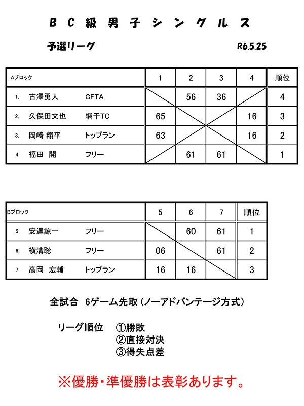 5/25 BC級男子シングルス大会結果 2024 6/06 大会結果 2024年6月6日 目次BC級男子シングルス大会(2024年5月25日開催) 2024年5月25日(土)、トップランテニスカレッジ石守校にて、加古川オープンサーキット「BC級男子シングルス大会」が開催されました。結果は以下の通りです。皆様、お疲れ様でした。 大会結果 5/18 CD級男子ダブルス大会結果 6/2 CD級女子ダブルス大会結果 関連記事 9/28 CD級男子シングルス大会結果 2025年9月29日 9/20 BC級男子シングルス大会結果 2025年9月24日 9/15 CD級男子シングルス大会結果 2025年9月24日 8/23 BC級男子シングルス大会結果 2025年8月27日 7/21 CD級男子シングルス大会結果 2025年7月28日 7/19 BC級男子シングルス大会結果 2025年7月23日 7/13 初心級男子シングルス大会結果 2025年7月14日 6/28 CD級男子シングルス大会結果 2025年6月30日
