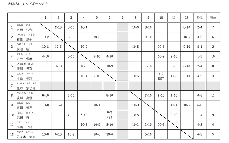2024年6月23日(日)、トップランテニスカレッジ石守校にて、「レッドボール大会」が開催されました。結果は以下の通りです。皆様、お疲れ様でした。