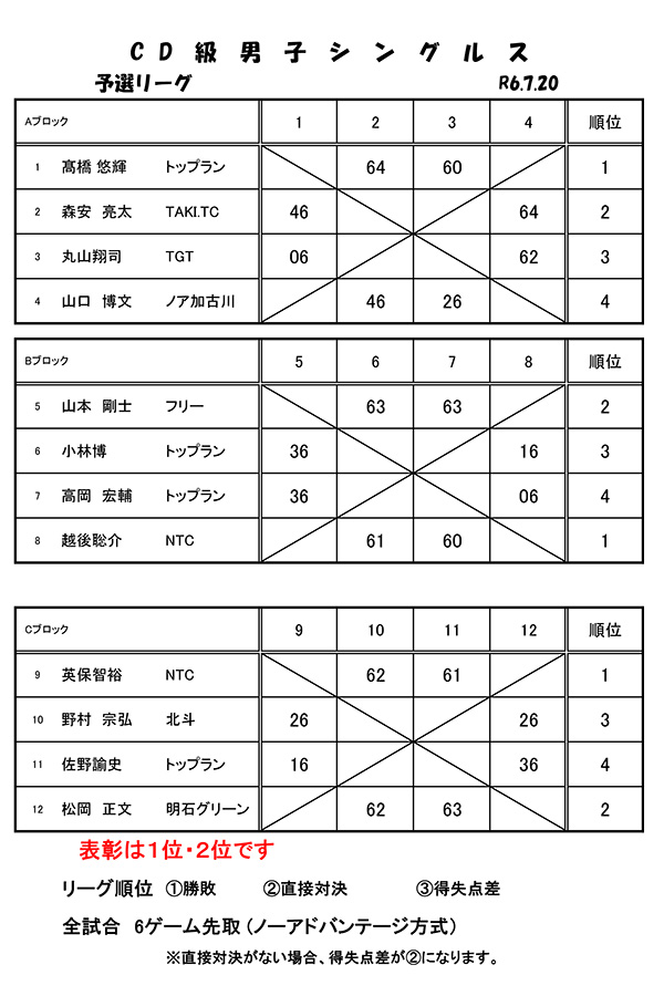 7/20 CD級男子シングルス大会結果 2024 7/23 大会結果 2024年7月23日 目次CD級男子シングルス大会(2024年7月20日開催) 2024年7月20日(土)、トップランテニスカレッジ石守校にて、加古川オープンサーキット「CD級男子シングルス大会」が開催されました。結果は以下の通りです。皆様、お疲れ様でした。 大会結果 7/15 CD級ミックスダブルス団体戦結果 7/21 初心級男子シングルス大会結果 関連記事 9/28 CD級男子シングルス大会結果 2025年9月29日 9/20 BC級男子シングルス大会結果 2025年9月24日 9/15 CD級男子シングルス大会結果 2025年9月24日 8/23 BC級男子シングルス大会結果 2025年8月27日 7/21 CD級男子シングルス大会結果 2025年7月28日 7/19 BC級男子シングルス大会結果 2025年7月23日 7/13 初心級男子シングルス大会結果 2025年7月14日 6/28 CD級男子シングルス大会結果 2025年6月30日