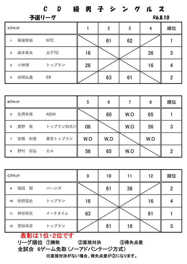 8/10 CD級男子シングルス大会結果 2024 8/26 大会結果 2024年8月26日 目次CD級男子シングルス大会(2024年8月10日開催) 2024年8月10日(土)、トップランテニスカレッジ石守校にて、加古川オープンサーキット「CD級男子シングルス大会」が開催されました。結果は以下の通りです。皆様、お疲れ様でした。 大会結果 8/4 BC級男子シングルス大会結果 8/25 オレンジボール大会結果 関連記事 9/28 CD級男子シングルス大会結果 2025年9月29日 9/20 BC級男子シングルス大会結果 2025年9月24日 9/15 CD級男子シングルス大会結果 2025年9月24日 8/23 BC級男子シングルス大会結果 2025年8月27日 7/21 CD級男子シングルス大会結果 2025年7月28日 7/19 BC級男子シングルス大会結果 2025年7月23日 7/13 初心級男子シングルス大会結果 2025年7月14日 6/28 CD級男子シングルス大会結果 2025年6月30日