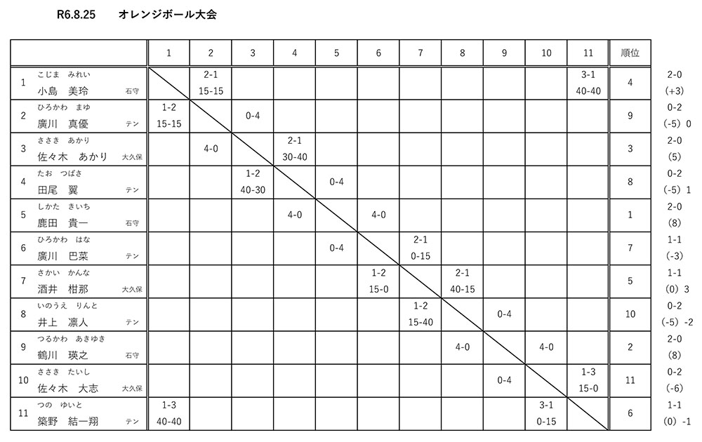 8/25 オレンジボール大会結果 2024 8/26 大会結果 2024年8月26日 目次オレンジボール大会(2024年8月25日開催) 2024年8月25日(日)、トップランテニスカレッジ石守校にて、「オレンジボール大会」が開催されました。結果は以下の通りです。皆様、お疲れ様でした。 大会結果 8/10 CD級男子シングルス大会結果 9/1 CD級女子シングルス大会結果 関連記事 9/28 CD級男子シングルス大会結果 2025年9月29日 9/20 BC級男子シングルス大会結果 2025年9月24日 9/15 CD級男子シングルス大会結果 2025年9月24日 8/23 BC級男子シングルス大会結果 2025年8月27日 7/21 CD級男子シングルス大会結果 2025年7月28日 7/19 BC級男子シングルス大会結果 2025年7月23日 7/13 初心級男子シングルス大会結果 2025年7月14日 6/28 CD級男子シングルス大会結果 2025年6月30日