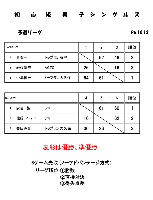 10/12 初心級男子シングルス大会結果 2024 10/16 大会結果 2024年10月16日 目次初心級男子シングルス大会(2024年10月12日開催) 2024年10月12日(土)、トップランテニスカレッジ石守校にて、加古川オープンサーキット「初心級男子シングルス大会」が開催されました。結果は以下の通りです。皆様、お疲れ様でした。 大会結果 9/29 CD級男子シングルス大会結果 10/13 グリーンボール大会結果 関連記事 9/28 CD級男子シングルス大会結果 2025年9月29日 9/20 BC級男子シングルス大会結果 2025年9月24日 9/15 CD級男子シングルス大会結果 2025年9月24日 8/23 BC級男子シングルス大会結果 2025年8月27日 7/21 CD級男子シングルス大会結果 2025年7月28日 7/19 BC級男子シングルス大会結果 2025年7月23日 7/13 初心級男子シングルス大会結果 2025年7月14日 6/28 CD級男子シングルス大会結果 2025年6月30日