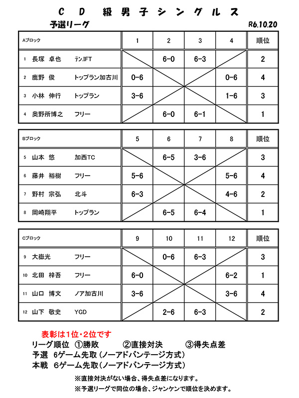 10/20 CD級男子シングルス大会結果 2024 10/25 大会結果 2024年10月25日 目次CD級男子シングルス大会(2024年10月20日開催) 2024年10月20日(日)、トップランテニスカレッジ石守校にて、加古川オープンサーキット「CD級男子シングルス大会」が開催されました。結果は以下の通りです。皆様、お疲れ様でした。 大会結果 10/13 グリーンボール大会結果 11/3 オレンジボール大会結果 関連記事 11/24 初心級男子シングルス大会結果 2025年11月26日 11/21 初心級女子ダブルス大会結果 2025年11月26日 11/8 BC級男子シングルス大会結果 2025年11月13日 11/3 CD級男子シングルス大会結果 2025年11月5日 10/11 初心級男子シングルス大会結果 2025年11月5日 9/28 CD級男子シングルス大会結果 2025年9月29日 9/20 BC級男子シングルス大会結果 2025年9月24日 9/15 CD級男子シングルス大会結果 2025年9月24日