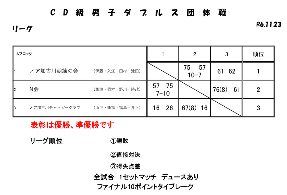 11/23 CD級男子ダブルス団体戦結果 2024 11/25 大会結果 2024年11月25日 目次CD級男子ダブルス団体戦(2024年11月23日開催) 2024年11月23日(土祝)、トップランテニスカレッジ石守校にて、加古川オープンサーキット「CD級男子ダブルス団体戦」が開催されました。結果は以下の通りです。皆様、お疲れ様でした。 大会結果 11/22 CD級女子ダブルス大会結果 11/24 CD級ミックスダブルス大会結果 関連記事 9/28 CD級男子シングルス大会結果 2025年9月29日 9/20 BC級男子シングルス大会結果 2025年9月24日 9/15 CD級男子シングルス大会結果 2025年9月24日 8/23 BC級男子シングルス大会結果 2025年8月27日 7/21 CD級男子シングルス大会結果 2025年7月28日 7/19 BC級男子シングルス大会結果 2025年7月23日 7/13 初心級男子シングルス大会結果 2025年7月14日 6/28 CD級男子シングルス大会結果 2025年6月30日