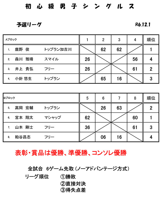 12/1 初心級男子シングルス大会結果 2024 12/03 大会結果 2024年12月3日 目次初心級男子シングルス大会(2024年12月1日開催) 2024年12月1日(日)、トップランテニスカレッジ石守校にて、加古川オープンサーキット「初心級男子シングルス大会」が開催されました。結果は以下の通りです。皆様、お疲れ様でした。 大会結果 11/24 CD級ミックスダブルス大会結果 12/7 CD級女子シングルス大会結果 関連記事 9/28 CD級男子シングルス大会結果 2025年9月29日 9/20 BC級男子シングルス大会結果 2025年9月24日 9/15 CD級男子シングルス大会結果 2025年9月24日 8/23 BC級男子シングルス大会結果 2025年8月27日 7/21 CD級男子シングルス大会結果 2025年7月28日 7/19 BC級男子シングルス大会結果 2025年7月23日 7/13 初心級男子シングルス大会結果 2025年7月14日 6/28 CD級男子シングルス大会結果 2025年6月30日