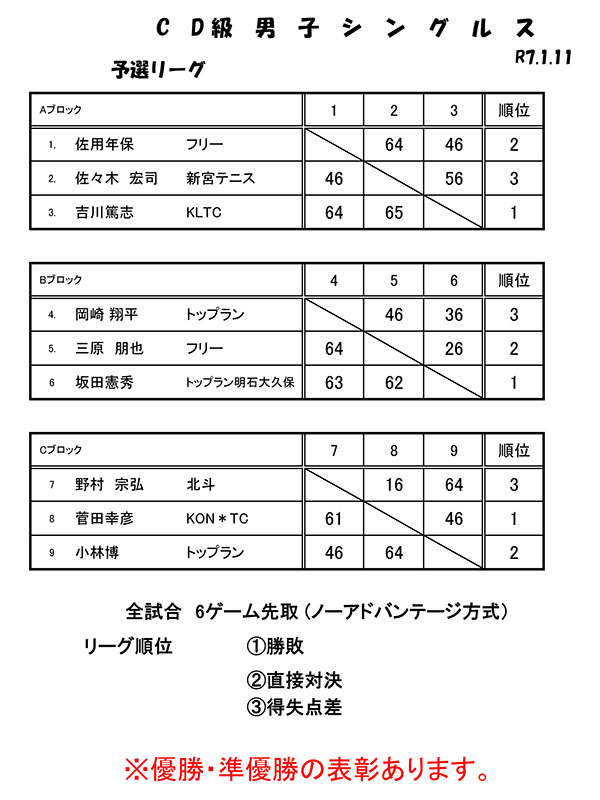 1/11 CD級男子シングルス大会結果 2025 1/20 大会結果 2025年1月20日 目次CD級男子シングルス大会(2025年1月11日開催) 2025年1月11日(土)、トップランテニスカレッジ石守校にて、加古川オープンサーキット「CD級男子シングルス大会」が開催されました。結果は以下の通りです。皆様、お疲れ様でした。 大会結果 12/21 CD級男子シングルス大会結果 1/13 オープン男子ダブルス団体戦結果 関連記事 9/28 CD級男子シングルス大会結果 2025年9月29日 9/20 BC級男子シングルス大会結果 2025年9月24日 9/15 CD級男子シングルス大会結果 2025年9月24日 8/23 BC級男子シングルス大会結果 2025年8月27日 7/21 CD級男子シングルス大会結果 2025年7月28日 7/19 BC級男子シングルス大会結果 2025年7月23日 7/13 初心級男子シングルス大会結果 2025年7月14日 6/28 CD級男子シングルス大会結果 2025年6月30日
