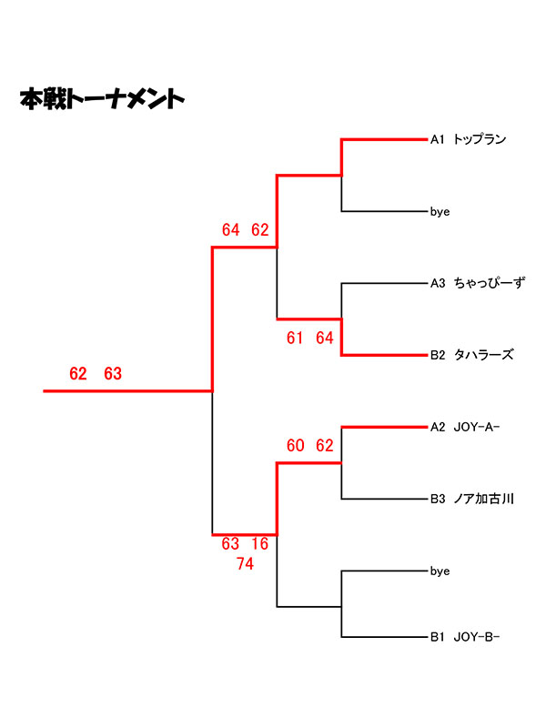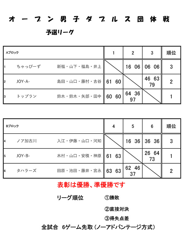 1/13 オープン男子ダブルス団体戦結果 2025 1/20 大会結果 2025年1月20日 目次オープン男子ダブルス団体戦(2025年1月13日開催) 2025年1月13日(月祝)、トップランテニスカレッジ石守校にて、加古川オープンサーキット「オープン男子ダブルス団体戦」が開催されました。結果は以下の通りです。皆様、お疲れ様でした。 大会結果 1/11 CD級男子シングルス大会結果 1/26 BC級男子シングルス大会結果 関連記事 9/28 CD級男子シングルス大会結果 2025年9月29日 9/20 BC級男子シングルス大会結果 2025年9月24日 9/15 CD級男子シングルス大会結果 2025年9月24日 8/23 BC級男子シングルス大会結果 2025年8月27日 7/21 CD級男子シングルス大会結果 2025年7月28日 7/19 BC級男子シングルス大会結果 2025年7月23日 7/13 初心級男子シングルス大会結果 2025年7月14日 6/28 CD級男子シングルス大会結果 2025年6月30日