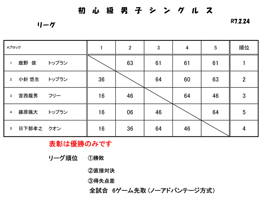 2/24 初心級男子シングルス大会結果 2025 2/26 大会結果 2025年2月26日 目次初心級男子シングルス大会(2025年2月24日開催) 2025年2月24日(月振休)、トップランテニスカレッジ石守校にて、加古川オープンサーキット「初心級男子シングルス大会」が開催されました。結果は以下の通りです。皆様、お疲れ様でした。 大会結果 2/21 CD級女子ダブルス大会結果 3/1 CD級男子シングルス大会結果 関連記事 9/28 CD級男子シングルス大会結果 2025年9月29日 9/20 BC級男子シングルス大会結果 2025年9月24日 9/15 CD級男子シングルス大会結果 2025年9月24日 8/23 BC級男子シングルス大会結果 2025年8月27日 7/21 CD級男子シングルス大会結果 2025年7月28日 7/19 BC級男子シングルス大会結果 2025年7月23日 7/13 初心級男子シングルス大会結果 2025年7月14日 6/28 CD級男子シングルス大会結果 2025年6月30日