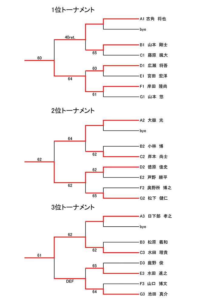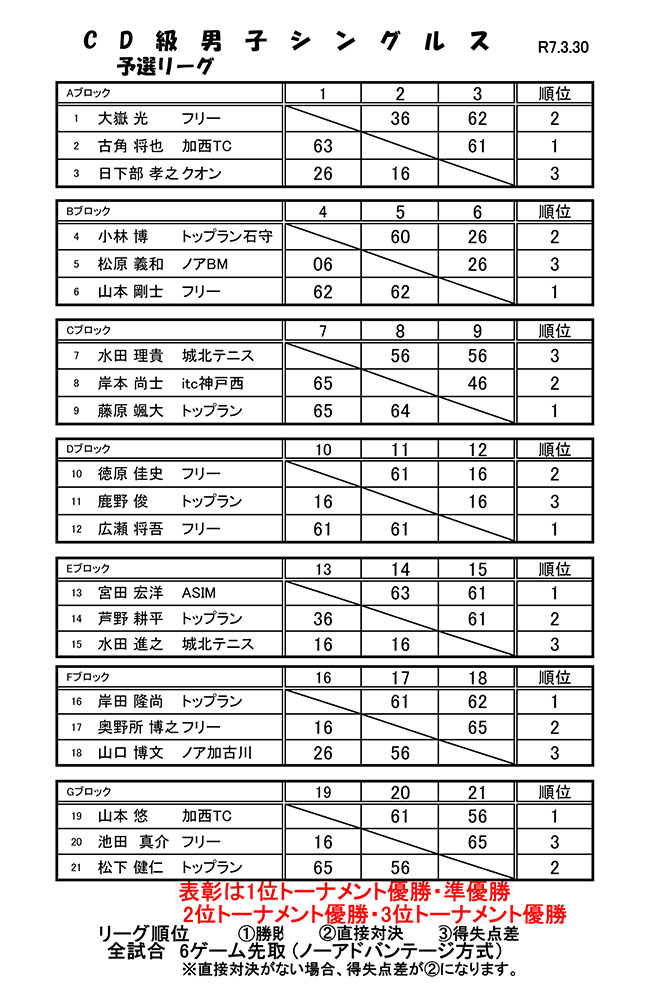 3/30 CD級男子シングルス大会結果 2025 4/03 お知らせ 大会結果 2025年4月3日 目次CD級男子シングルス大会(2025年3月30日開催) 2025年3月30日(日)、トップランテニスカレッジ石守校にて、加古川オープンサーキット「CD級男子シングルス大会」が開催されました。結果は以下の通りです。皆様、お疲れ様でした。 1位トーナメント 2位トーナメント優勝 3位トーナメント優勝 お知らせ 大会結果 3/22 CD級女子シングルス大会結果 2025年4月27日(日)「トップラントレセン」緊急募集!! 関連記事 2025年10月12日(日)開催「トップラントレセン」緊急募集!! 2025年10月6日 9/28 CD級男子シングルス大会結果 2025年9月29日 9/20 BC級男子シングルス大会結果 2025年9月24日 9/15 CD級男子シングルス大会結果 2025年9月24日 8/23 BC級男子シングルス大会結果 2025年8月27日 7/21 CD級男子シングルス大会結果 2025年7月28日 7/19 BC級男子シングルス大会結果 2025年7月23日 7/13 初心級男子シングルス大会結果 2025年7月14日