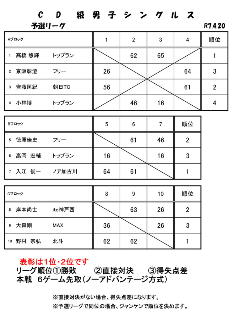 4/20 BC級男子シングルス大会結果 2025 4/28 大会結果 2025年4月28日 目次BC級男子シングルス大会(2025年4月20日開催) 2025年4月20日(日)、トップランテニスカレッジ石守校にて、加古川オープンサーキット「BC級男子シングルス大会」が開催されました。結果は以下の通りです。皆様、お疲れ様でした。 大会結果 3/30 CD級男子シングルス大会結果 4/29 CD級男子シングルス大会結果 関連記事 9/28 CD級男子シングルス大会結果 2025年9月29日 9/20 BC級男子シングルス大会結果 2025年9月24日 9/15 CD級男子シングルス大会結果 2025年9月24日 8/23 BC級男子シングルス大会結果 2025年8月27日 7/21 CD級男子シングルス大会結果 2025年7月28日 7/19 BC級男子シングルス大会結果 2025年7月23日 7/13 初心級男子シングルス大会結果 2025年7月14日 6/28 CD級男子シングルス大会結果 2025年6月30日