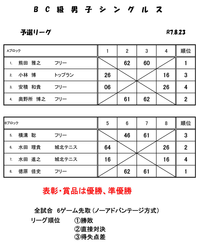 8/23 BC級男子シングルス大会結果 2025 8/27 大会結果 2025年8月27日 目次BC級男子シングルス大会(2025年8月23日開催) 2025年8月23日(土)、トップランテニスカレッジ石守校にて、加古川オープンサーキット「BC級男子シングルス大会」が開催されました。結果は以下の通りです。皆様、お疲れ様でした。 大会結果 7/21 CD級男子シングルス大会結果 9/15 CD級男子シングルス大会結果 関連記事 9/28 CD級男子シングルス大会結果 2025年9月29日 9/20 BC級男子シングルス大会結果 2025年9月24日 9/15 CD級男子シングルス大会結果 2025年9月24日 7/21 CD級男子シングルス大会結果 2025年7月28日 7/19 BC級男子シングルス大会結果 2025年7月23日 7/13 初心級男子シングルス大会結果 2025年7月14日 6/28 CD級男子シングルス大会結果 2025年6月30日 6/22 BC級男子シングルス大会結果 2025年6月25日