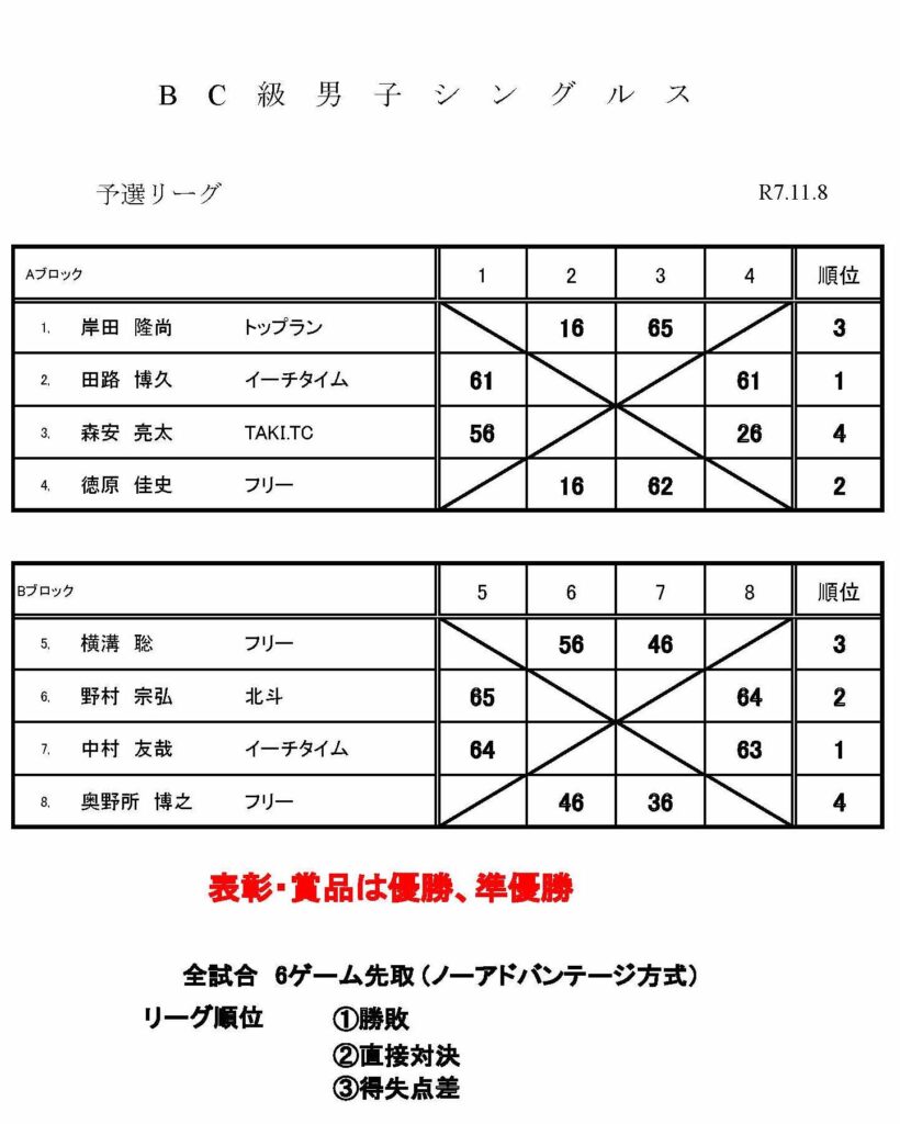 11/8 BC級男子シングルス大会結果 2025 11/13 大会結果 2025年11月13日 目次BC級男子シングルス大会(2025年11月8日開催) 2025年11月8日(土)、石守校にて、「BC級男子シングルス大会」を開催しました。 スクロールできます 大会結果 11/3 CD級男子シングルス大会結果 関連記事 11/3 CD級男子シングルス大会結果 2025年11月5日 10/11 初心級男子シングルス大会結果 2025年11月5日 9/28 CD級男子シングルス大会結果 2025年9月29日 9/20 BC級男子シングルス大会結果 2025年9月24日 9/15 CD級男子シングルス大会結果 2025年9月24日 8/23 BC級男子シングルス大会結果 2025年8月27日 7/21 CD級男子シングルス大会結果 2025年7月28日 7/19 BC級男子シングルス大会結果 2025年7月23日